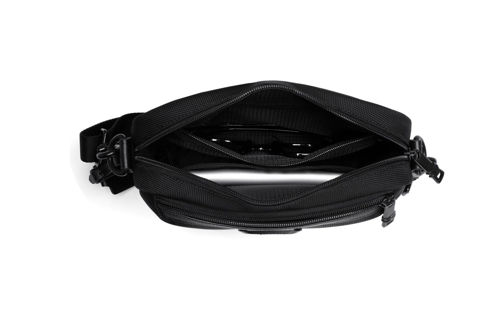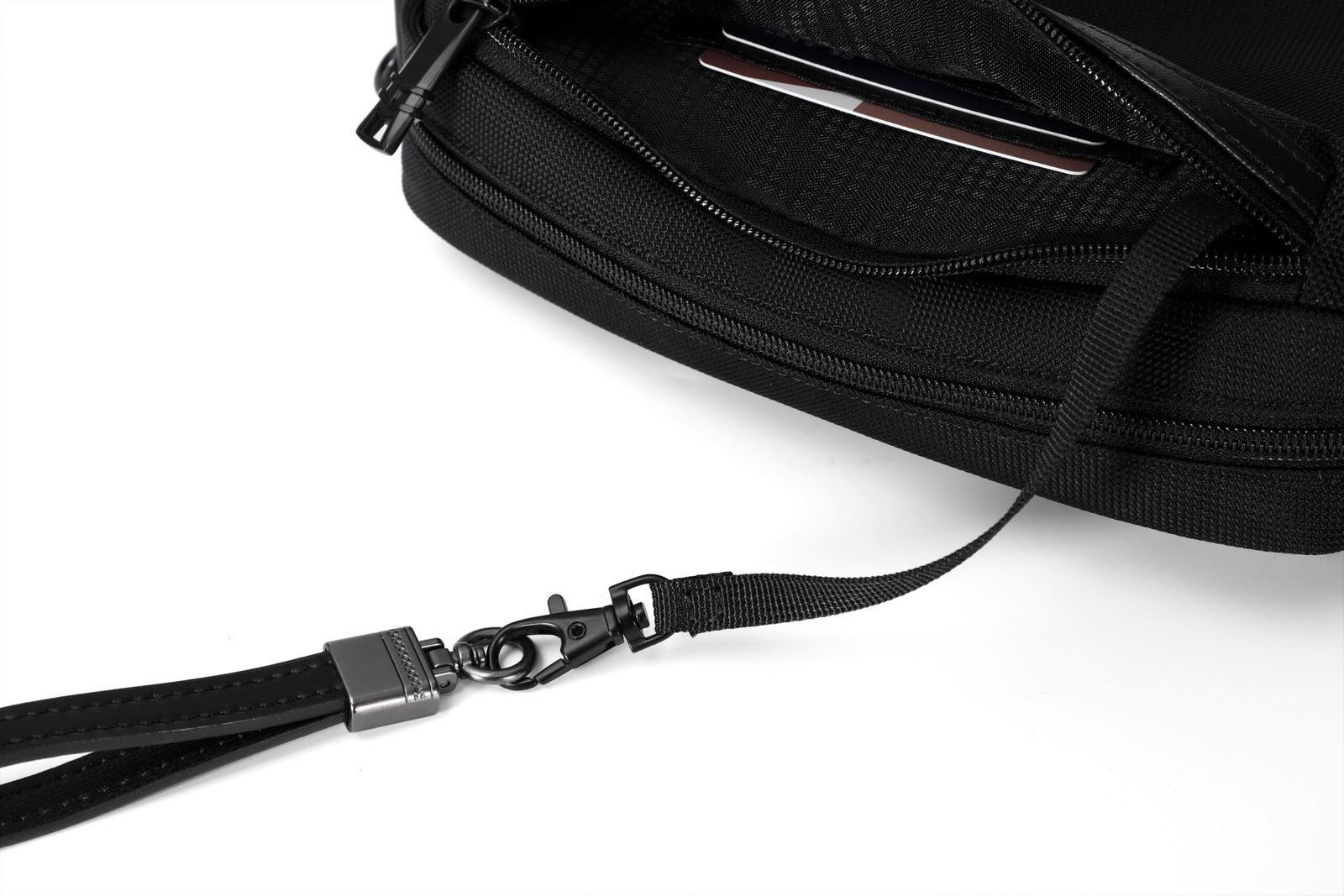 One Compartment with zipper and organization zipper pockets inside, 1 front zipper pocket with organization slots and key chain inside, 1 Back Fast Pocket.